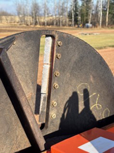 This unit has been extremely well cared for and was never abused. The paint is in excellent condition because it never sat outside. The blades are original and still are in very good condition. There are three sets of blades on the impeller – a total of nine blades in all. We have three replacement blades that come with the machine. The impeller is one-inch-thick steel and is 42 inches in diameter. It weighs 410 pounds by itself!! The entire machine weighs just under 2000 lbs – it is heavy duty and extremely well built. The optional speed sensor was not working when I purchased the machine. We have attempted to repair it but cannot verify that it works. The reason being is because the tractor I used to operate this unit was high enough horsepower (53 hp to the PTO) that we could not draw it down enough to engage the speed sensor. Therefore, I am unsure if it works properly. During my ownership, I replaced one hydraulic hose that developed a leak and the hydraulic motor that developed a small leak. The same motor, after replacement, continues to have a very small leak – a few drops after each use. Everything else remains in proper working order.